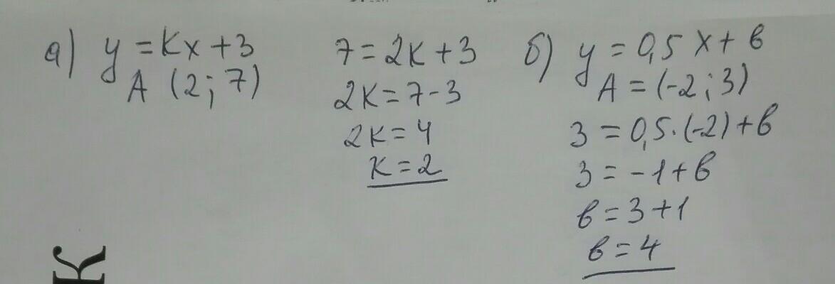 a)при каком значении k прямая у=kx+3 проходит через точку A(2;7)?
