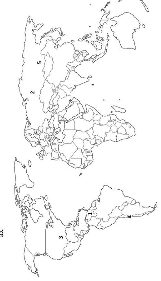 На контурной карте мира цифрами показаны географические объекты. Определите их.