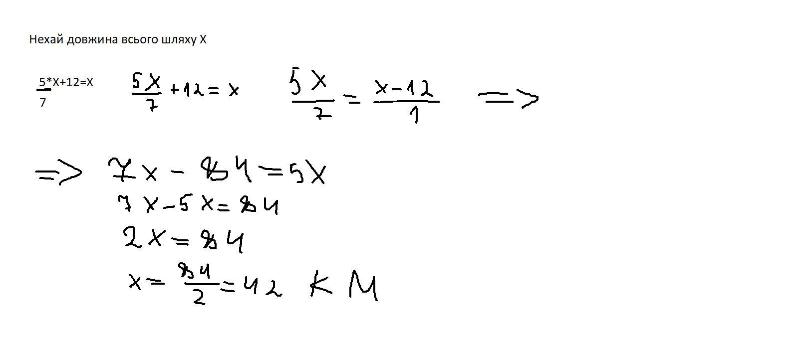 Після того, як туристи пройшли 5/7 туристичного маршруту, їм залишилося пройти 12 км. З'ясуй довжину всього шляху.