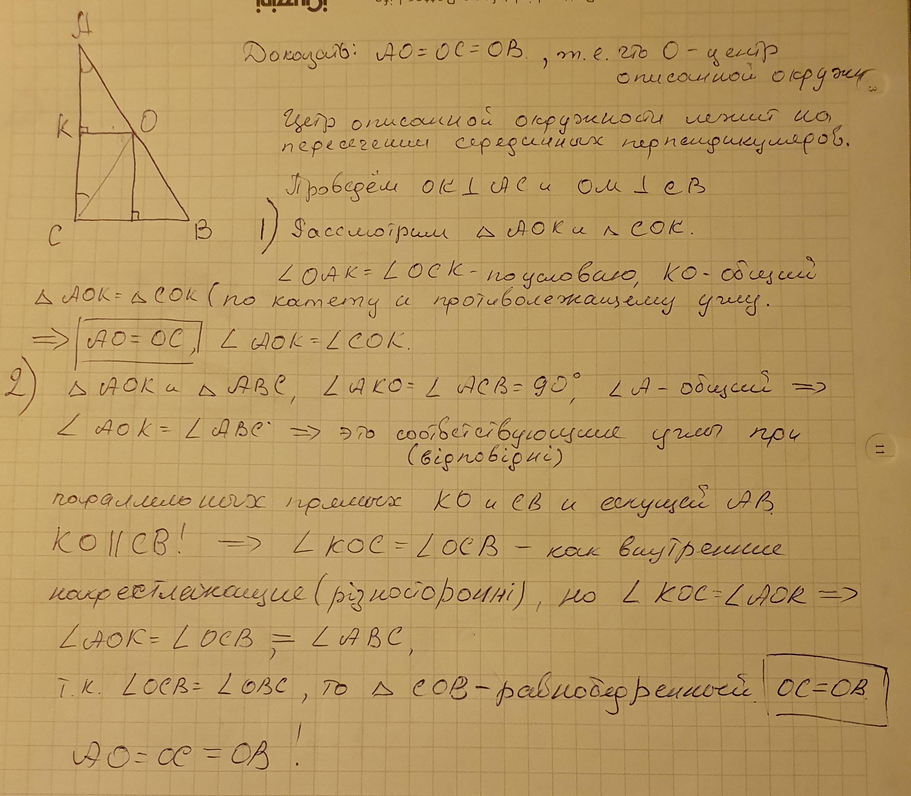 О-середина гипотенузы, так как треугольник АОС по условию равнобедренный, а равенство сторон в нем АО и СО может быть в прямоугольном треугольнике только в случае, если ОС-медиана и радиус описанной окружности с центром в точке О-а это и сть условие равноудаленности точки О от А,В,С