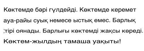 көк(бітеу)-тем(бітеу)-де(ашық) бә(ашық)-рі(ашық) гүл(бітеу)-дей(бітеу)-ді(ашық). Көк(бітеу)-тем(бітеу)-де(ашық) ке(ашық)-ре(ашық)-мет(бітеу) а(ашық)-уа(ашық)-ра(ашық)-йы(ашық) су(ашық)-ық(тұйық) не(ашық)-ме(ашық)-се(ашық) ыс(тұйық)-тық(бітеу) е(ашық)-мес(бітеу). Бар(бітеу)-лық(бітеу) ті(ашық)-рі(ашық) о(ашық)-я(ашық)-на(ашық)-ды(ашық). Бар(бітеу)-лы(ашық)-ғы(ашық) көк(бітеу)-тем(бітеу)-ді(ашық) жақ(бітеу)-сы(ашық) кө(ашық)-ре(ашық)-ді(ашық). Көк(бітеу)-тем(бітеу) - жыл(бітеу)-дың(бітеу) та(ашық)-ма(ашық)-ша(ашық) уа(ашық)-қы(ашық)-ты(ашық)!