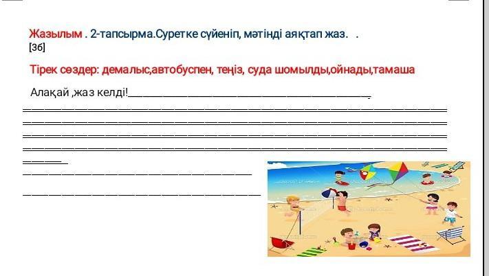 Алақай жаз келді ендібіз өзен пляжына бара аламыз достарымжа келеді.Мен достарымен құм ойнаймын жане де жүземіз Жазғы демалыс біткенде сабақа барамыз