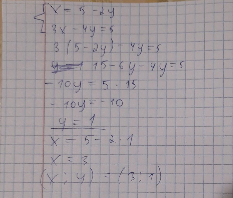 3(5 - 2y) - 4y = 5 *подставил значение х во вторую часть системы