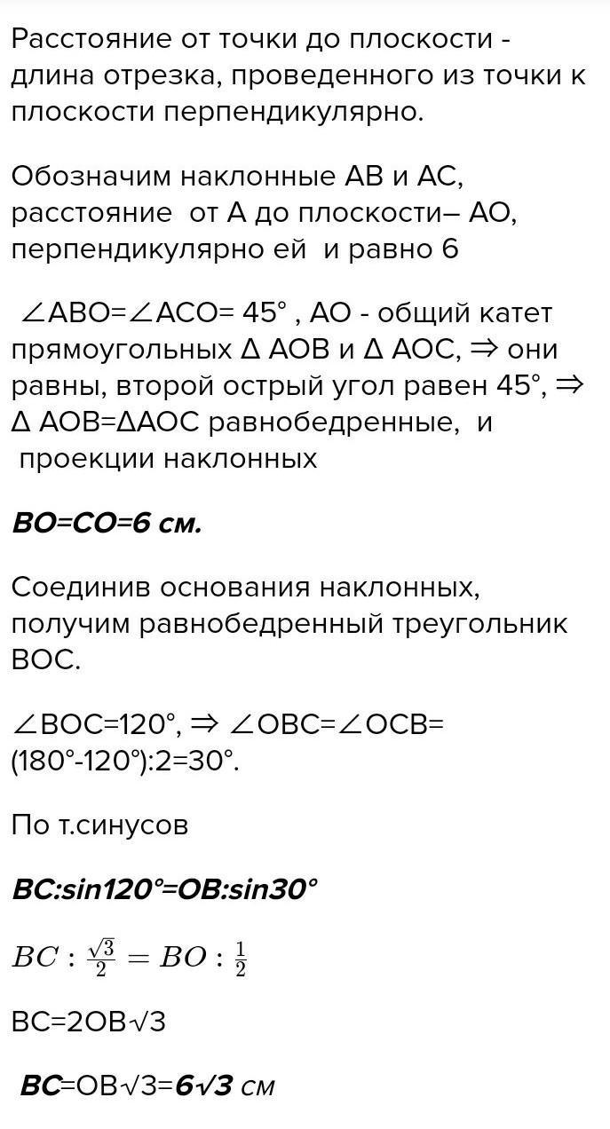 Iз точки, віддаленої від площини на 6 см, проведено дві рівні похилі. Знайдіть відстань між основами похилих, якщо відомо, шо похилі перцендикулярні між собою i утворюють з перпендикуляром до площини кути, що дорівнюють 60°.