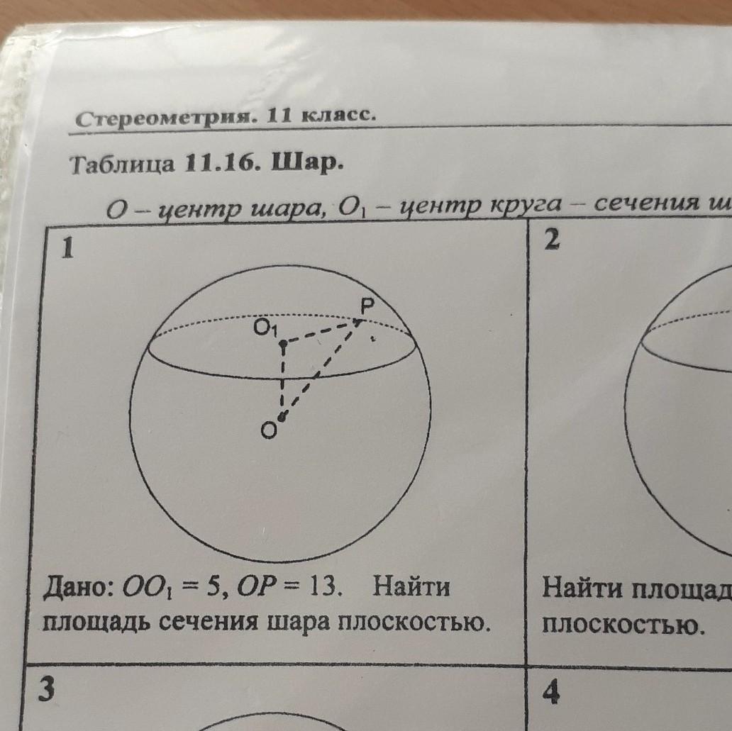 Извини, ошибка. Должно быть (PO1) ²=OP²-(OO1) ²=169-25=144. Тогда площадь сечения 3,14×144=452,16
