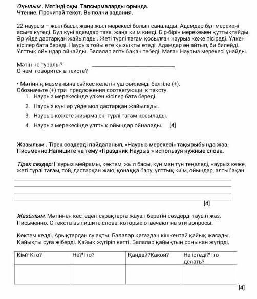 Наурыз - жыл басы . Наурыз кезінде күн мен түн теңеледі . Адамдар ұлттық киімдерін киіп , той жасап , жеті түрлі тағамнан наурыз көже дайындап , қонаққа барады . Балалар алтыбақан ойынын ойнайды . Маған наурыз мейрамы ұнайды.