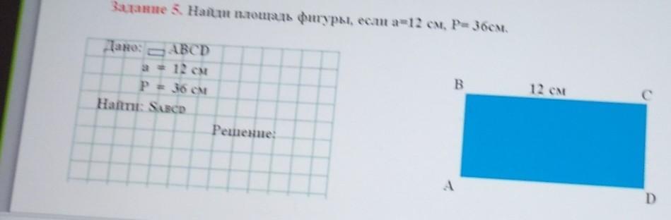 Задание 5. Найди площадь фигуры, если а=12 см, Р= 36см.