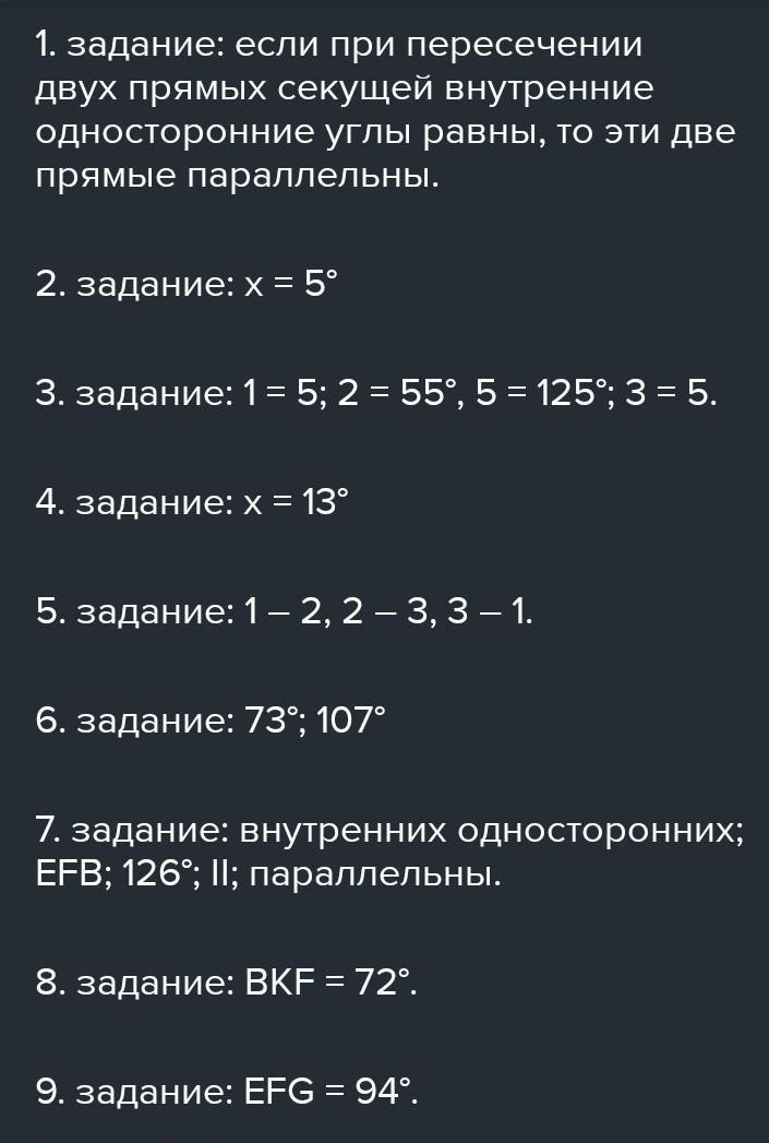 7. задание: внутренних односторонних; EFB; 126°; II; параллельны.