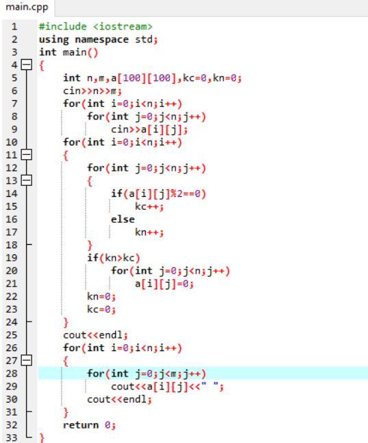 Дан двумерный массив из n строк и m столбцов. Замените в этом массиве все строки, в которых нечетных чисел строго больше, чем четных, на строчки из нулей