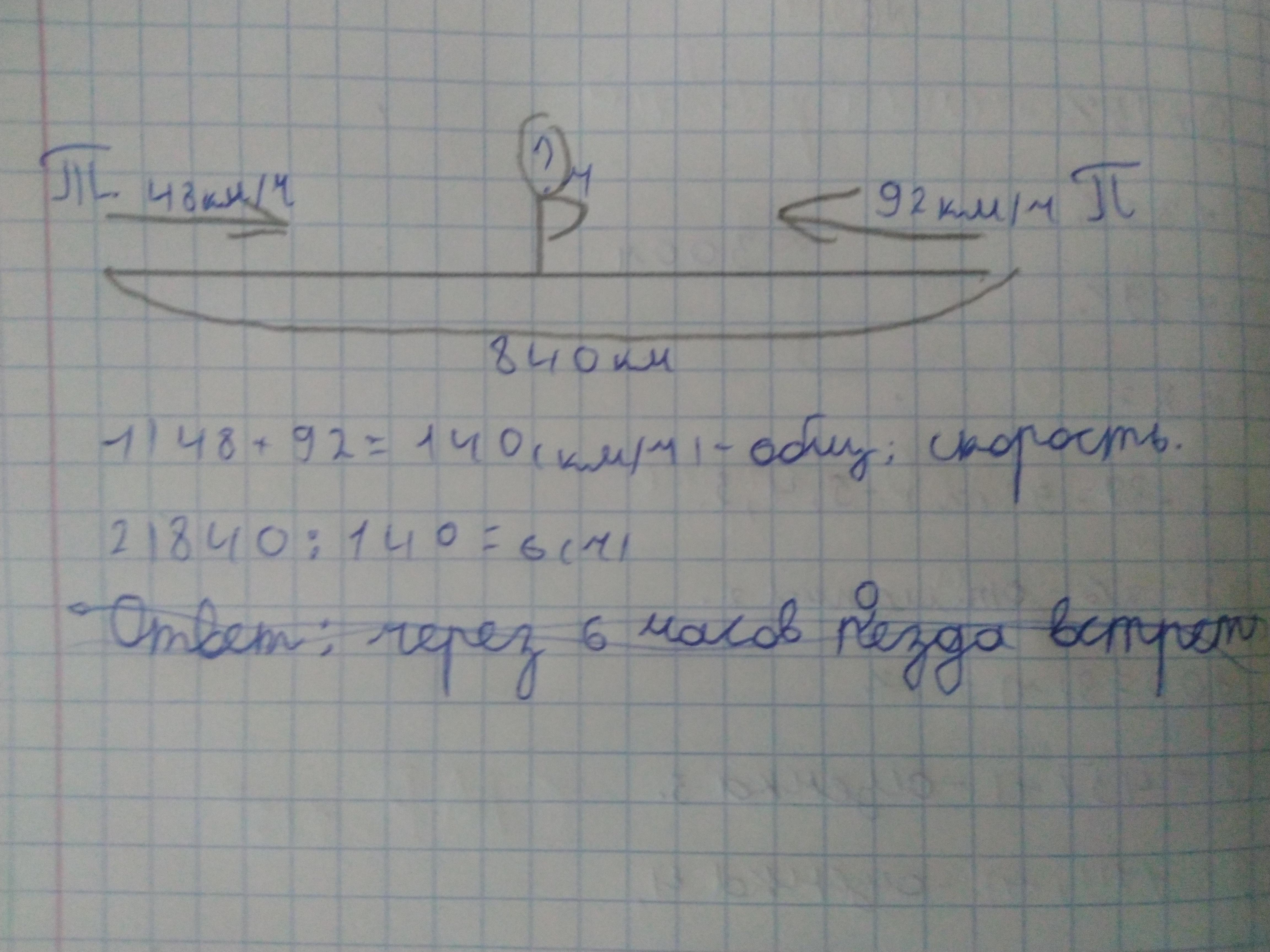 Товарный - 48 км/ч. Пассажирский- 92 км/ч. Расстояние - 840 км. Время встречи - ? ч.