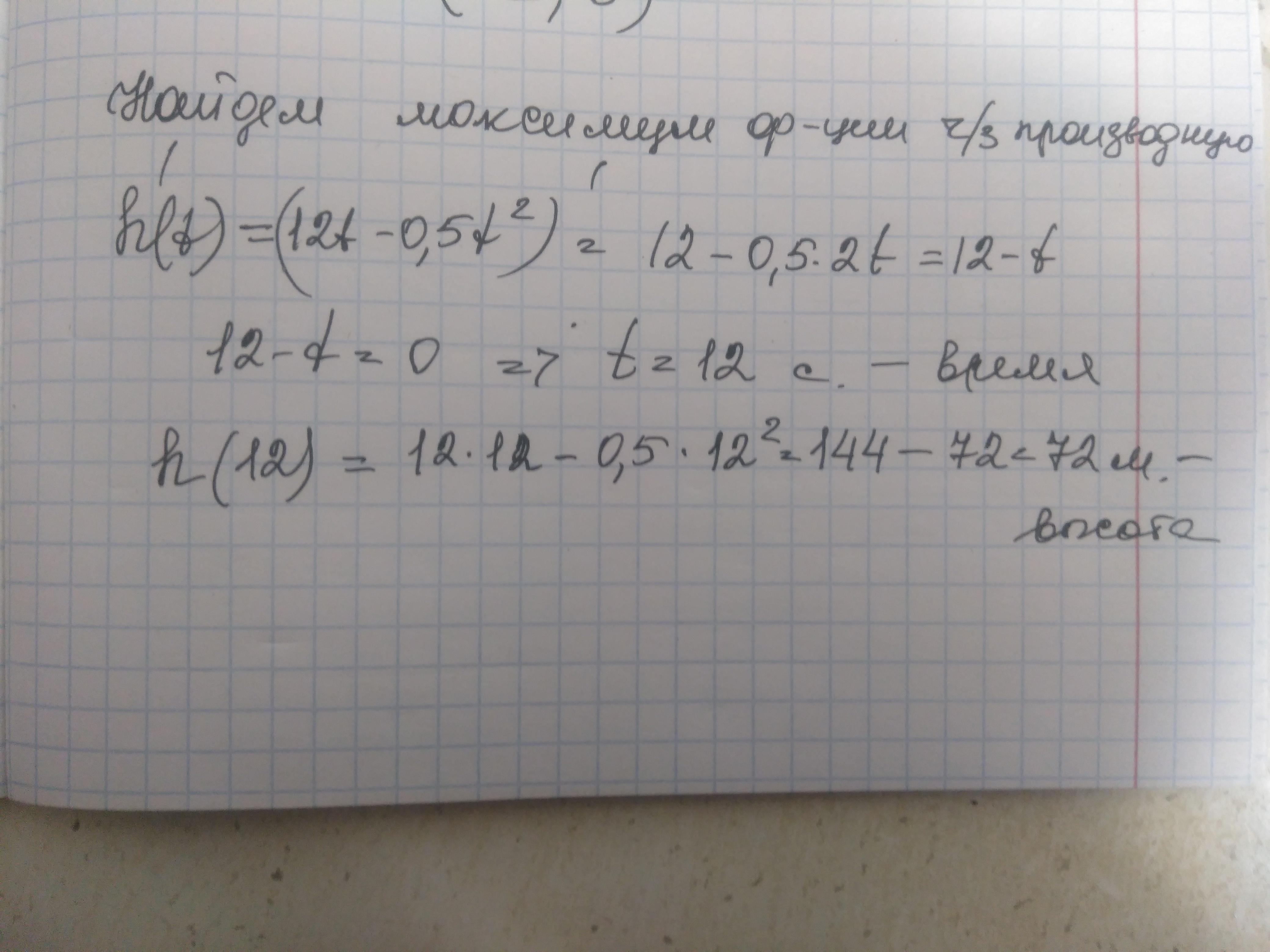 Тело, брошенное вертикально вверх, движется по закону h (t) = 12t-0.5t² (h–в метрах, t–в секундах). Определите: 1) В какой момент времени тело достигнет наибольшей высоты; 2) Каково будет её значение в этот момент.