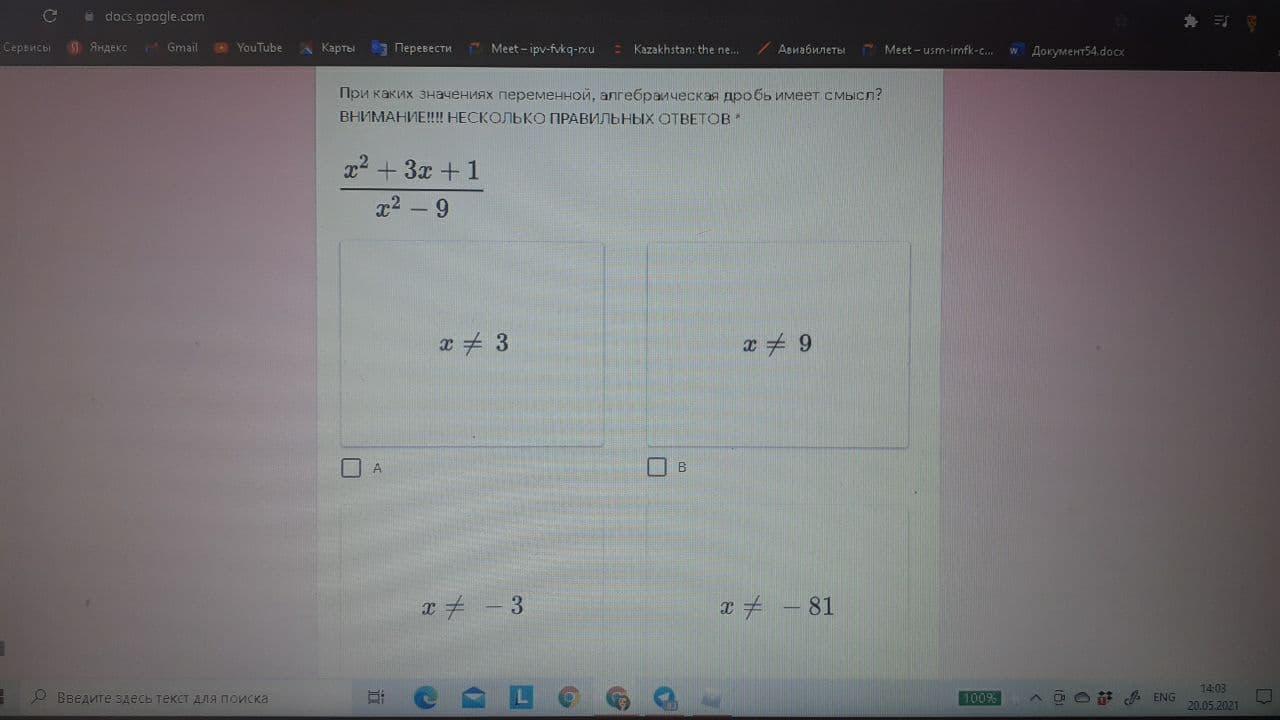 При каких значениях переменной, алгебраическая дробь имеет смысл?ВНИМАНИЕ!!!! НЕСКОЛЬКО ПРАВИЛЬНЫХ ОТВЕТОВ *