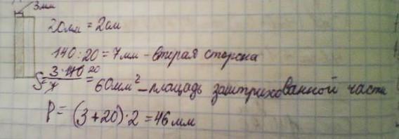 начерти прямоугольник площадь которого равна 140 мм2 а одна из сторон равна 20 мм заштрихуй 3/7 этого прямоугольника найди площадь и периметр заштрихованной части.
