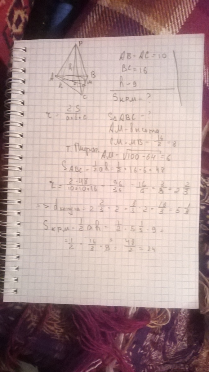 Основанием пирамиды является равнобедренный треугольник,основание которого равно 16 см ,а боковая сторона -10 cм.В пирамиду вписан конус.Найдите площадь осевого сечения конуса,если его высота равна 9 см.