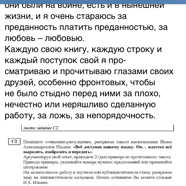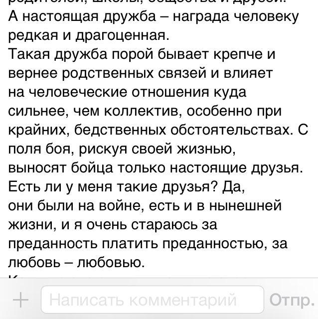 Настоящая дружба-награда человеку,редкая и бесценная .Такая дружба порой бывает крепче родственных уз и влияет на наше отношение к миру куда больше,чем он сам.Именно настоящие друзья уносят раненного с поля боя,рискуя своей жизнью.Есть ли у меня такие друзья?Да,были на войне и есть в нынешней жизни,и я стараюсь платить за преданность преданностью,за любовь-любовью.Каждый свой поступок я просматриваю глазами друзей,чтобы не было стыдно перед ними,за некачественно сделанную работу.(Это хорошее изложение,мало что можно сократить не потеряв смысл текста)