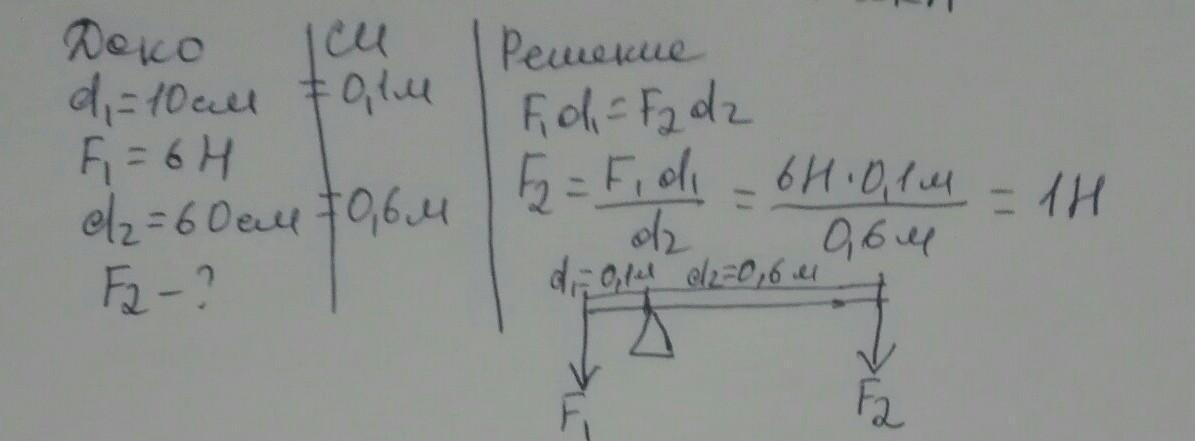 не меньшее плечо рычага длиной 10 см действует сила 6 н. какую силу надо приложить к большему плечу рычага длиной 60 см чтобы привести рычаг в равновесие(сделайте чертёж)