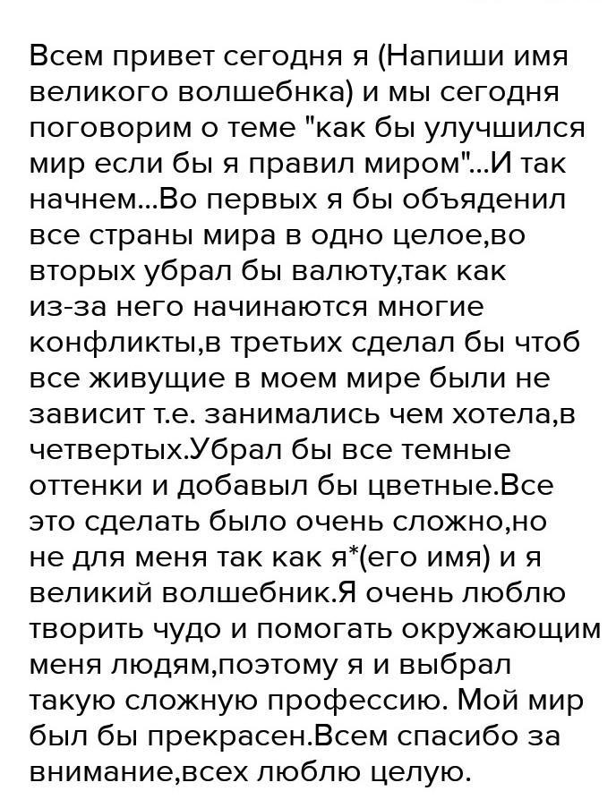 ответ: если я бы правила миром то все бы я поменяла построила много разных домов для бедных и для много детных детей и еслибы я правила миром то построила больше магазинов а так же если бы я правила миром изменила бы я школы в каждой школе были бы шкавчики куда можно ложить одежу чтобы не чего не воровали,у шкавчиков будут ключи чтобы их закрывать а так же учителям повысят зарплату, еда в столовой будет бесплатная, а так же если бы я правила миром то я бы поставила фантаны в центрох города,и если бы я правила миром то я бы построила на каждой уличе плашадку для детей и туда поставила камеры чтобы площадки не ломали и я бы поставила больше лавачек для дедушек и бабушек