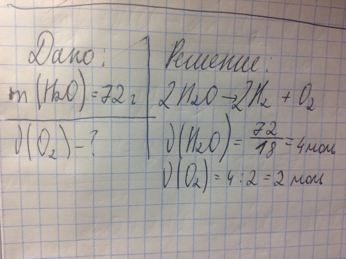 Рассчитайте химическое количество О (кислорода), которое образуется при разложении воды массой - 72 грамма.