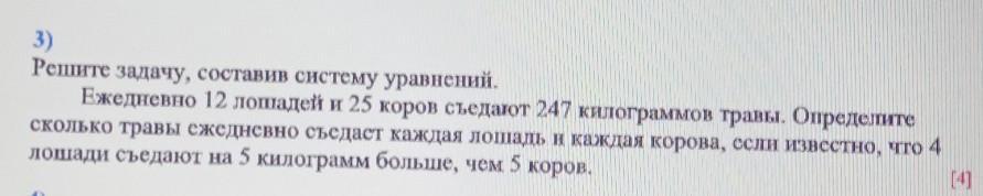 Ежедневно 12 лошадей и 25 коров съедают 247 килограммов травы. Определите