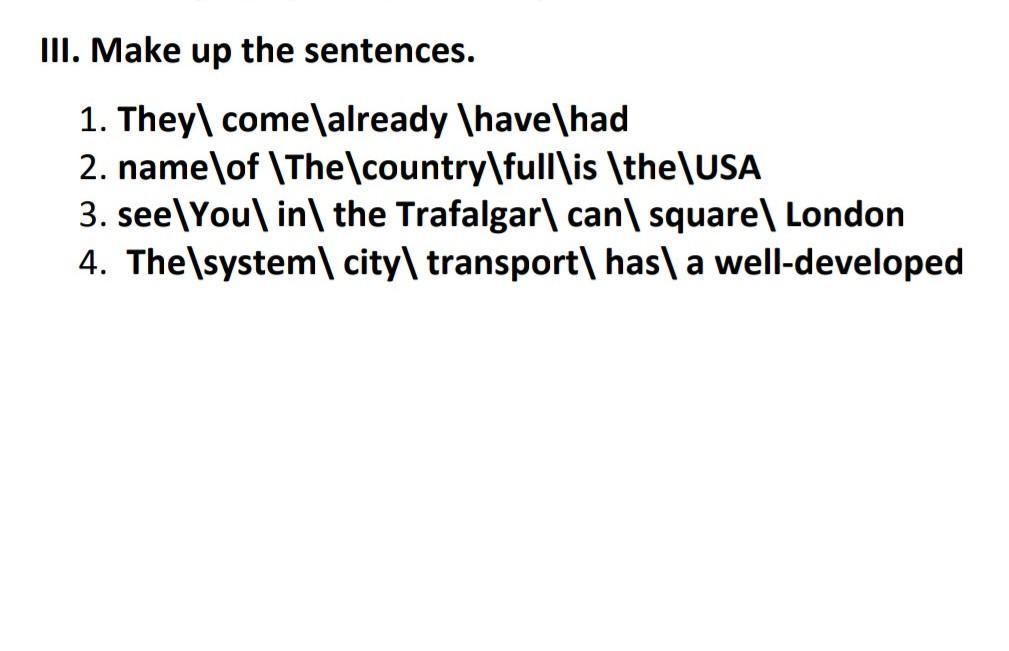 помогите с английским пожалуйстаII. Make up the sentences. 1. They \ comelalready \ have \ had 2. naёme \ of \ The \ country \ full \ is \ the \ USA 3. see \ You \ in \ the Trafalgar \ can \ square \ London 4. The \ system \ cityl transport \ hasl a well-develoрed