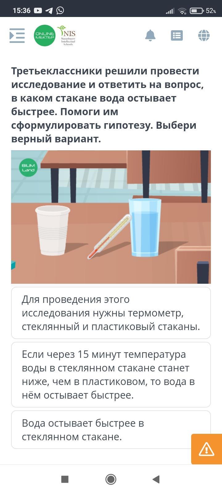 Если через 15 минут температура воды в стеклянном стакане станет ниже, чем в пластиковом, то вода в нём остывает быстрее.