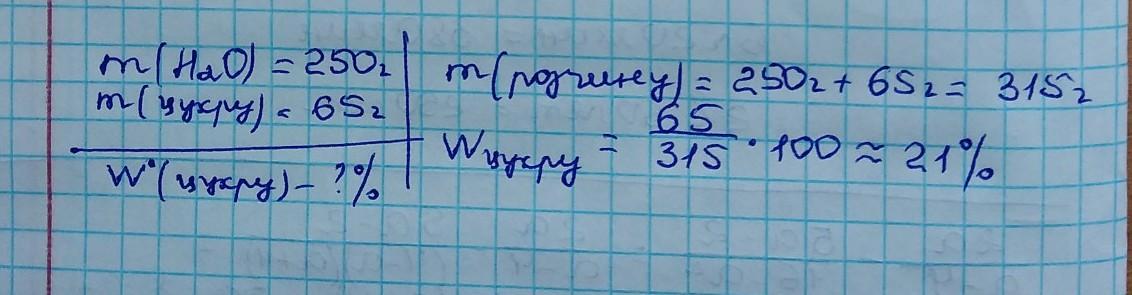 У воді масою 250 г розчинили 65 г цукру. Яка масова частка розчиненої речовини в отриманому розчині?