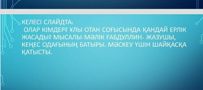 КЕЛЕСІ СЛАЙДТА: ОЛАР КІМДЕР? ҰЛЫ ОТАН СОҒЫСЫНДА ҚАНДАЙ ЕРЛІК ЖАСАДЫ? МЫСАЛЫ-МӘЛІК ҒАБДУЛЛИН- ЖАЗУШЫ, КЕҢЕС ОДАҒЫНЫҢ БАТЫРЫ. МӘСКЕУ ҮШІН ШАЙҚАСҚА ҚАТЫСТЫ.