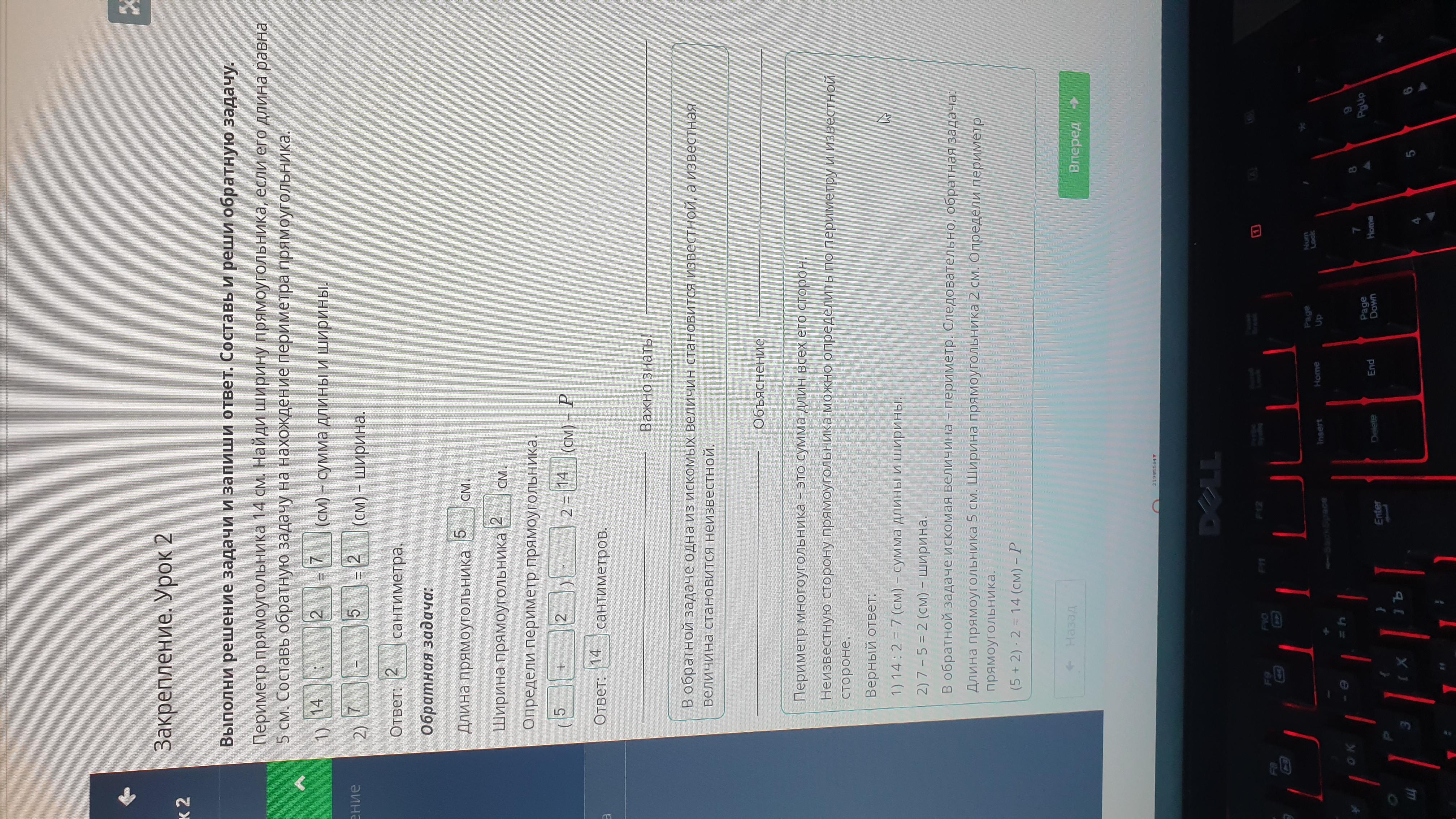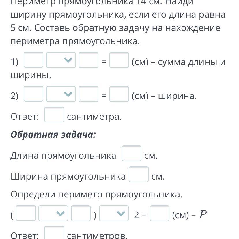 Периметр прямоугольника 14 см. Найди ширину прямоугольника, если его длина равна 5 см. Составь обратную задачу на нахождение периметра прямоугольника.
