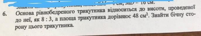 Основа рінвнобедренного трикутника відноситься до висоти проведеної до неї як 8:3 а площа трикутника дорівнює 48 см² Знайдіть бічну сторону цього трикутника