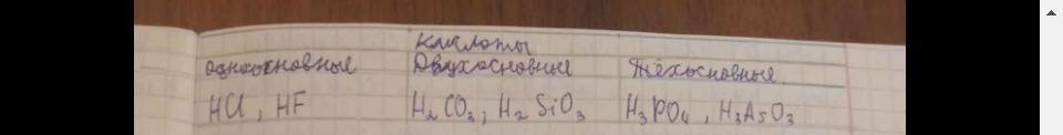 Кислоты классифицируются по содержанию водорода на одноосновные, двухосновные, трёхосновные. Запишите примеры формул кислот (не менее двух):