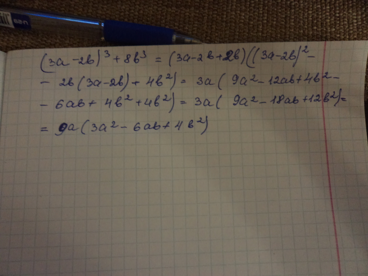 (3a-2b)^3-(2b)^3=(3a-2b+2b)*((3a-2b)^2-(3a-2b)*2b+(2b)^2)=3a*(9a^2-12ab+4b^2-6ab+4b^2+4b^2)=3a*(9a^2-18ab+12b^2)=12a*(3a^2-6ab+4b^2)