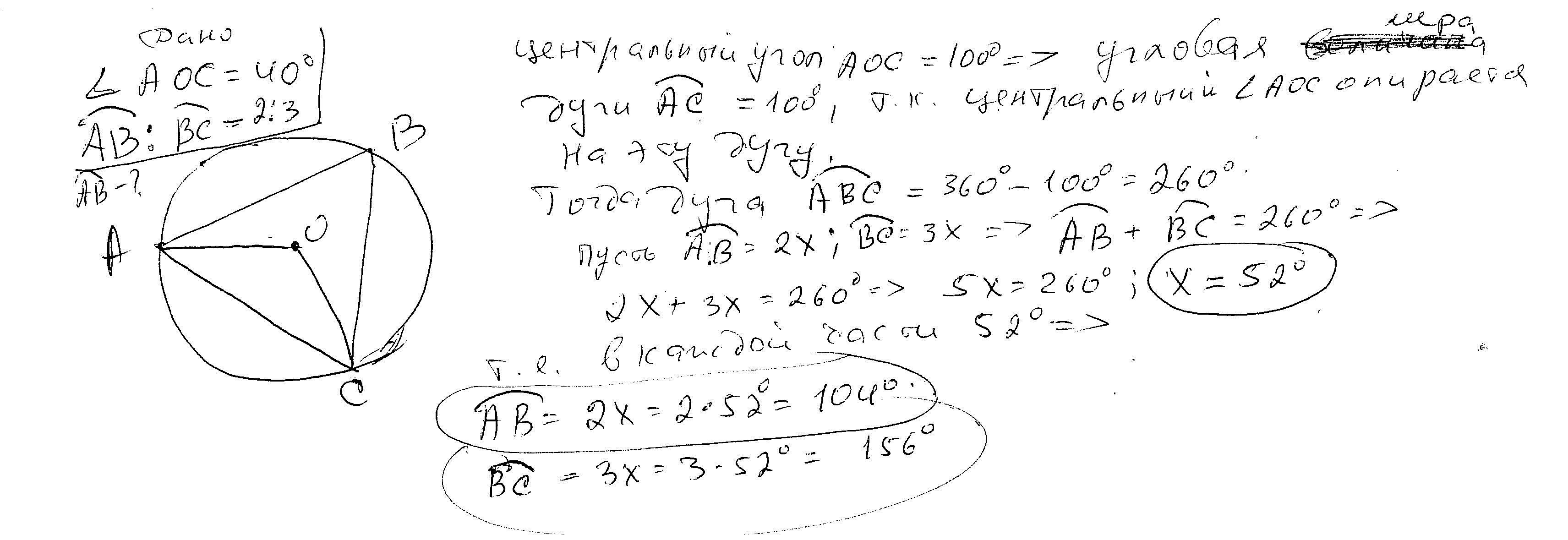 В окружность с центром О. вписан ДАВС так, что ZAOC = 100º. UAB:U BC = 2:3. Найдите