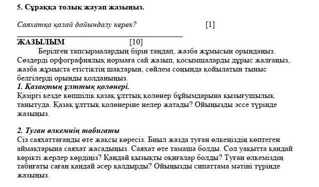 Сіз саяхаттағанды өте жақсы көресіз. Биыл жазда туған өлкеңіздің көптеген аймақтарына саяхат жасадыңыз. Саяхат өте тамаша болды. Сол уақытта қандай көрікті жерлер көрдіңіз? Қандай қызықты оқиғалар болды? Туған өлкеміздің табиғаты саған қандай әсер қалдырды? Ойыңызды сипаттама мәтіні түрінде жазыңыз..