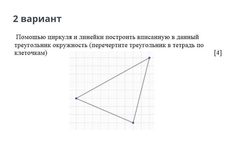 Помощью циркуля и линейки построить вписанную в данный треугольник окружность (перечертите треугольник в тетрадь по клеточкам) Даю 40 баллов