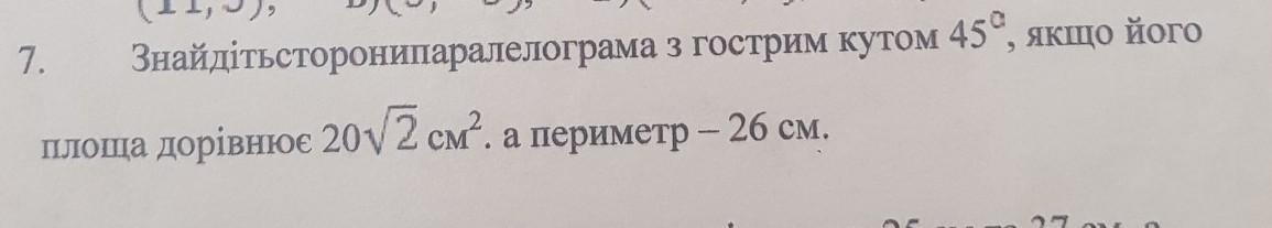 Найти стороны параллелограмма с острым углом 45° , если его площадь равна 20√2 см², а периметр 26 см