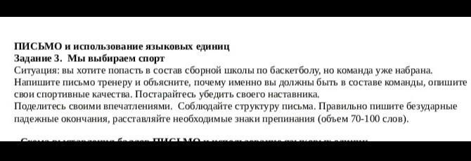 Ответ:Здравствуйте тренер! Меня зовут Т/И Т/Ф , мне Т/В. Я бы хотел(а) попасть в состав сборной школу по баскетболу! Увлекаюсь я баскетболом уже давно с 7-ми лет , мне очень нравится этот вид спорта . Каждый раз играя с друзьями баскетбол я начинаю чувствовать себя необычно , бегая по баскетбольному корту с мячом и закидывая мяч в кольцо я чувствую свободу , забивая мяч в воздухе я чувствую что я словно птица что выбралась из клетки.
