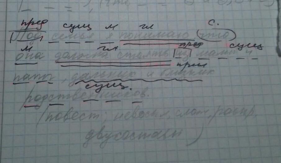 Синтаксический разбор предложения: Под семья я понимаю, что она должна стоять из мамы и папы, дальних и близких родственников.