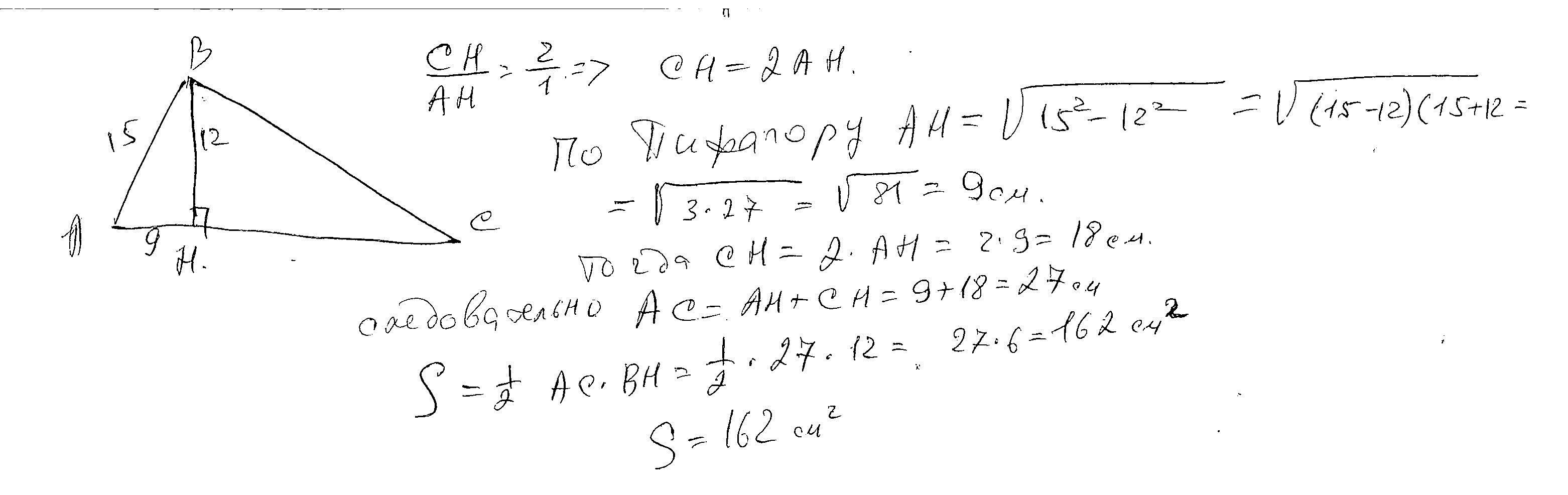 Висота трикутника завдовжки 12 см ділить основу у відношенні 1:2. Знайдіть площу трикутника, якщо менша бічна сторона 15 см. Срочно!!! Даю 30 б