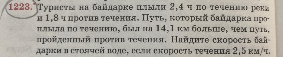 2,4*(х+2,5)-1,8*(х-2,5)=14,1; 2,4х+6-1,8 х+4,5=14,1; 0,6х=3,6; х=6 км/ч