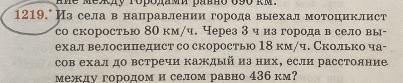 436-(80*3)=196 км-было между ними когда выехал велосипедист 80+18=98 км/ч-скорость сближения 196:98=2 часа-они встретятся Получается что мотоциклист ехал 5 часов а велосипедист 2 часа