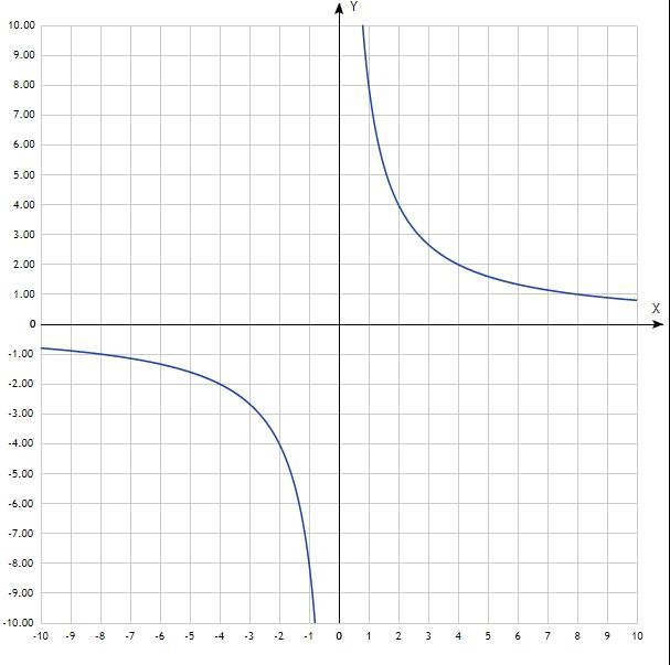 График - гипербола. Придать значения х, подставить в уравнение, вычислить у, записать в таблицу.