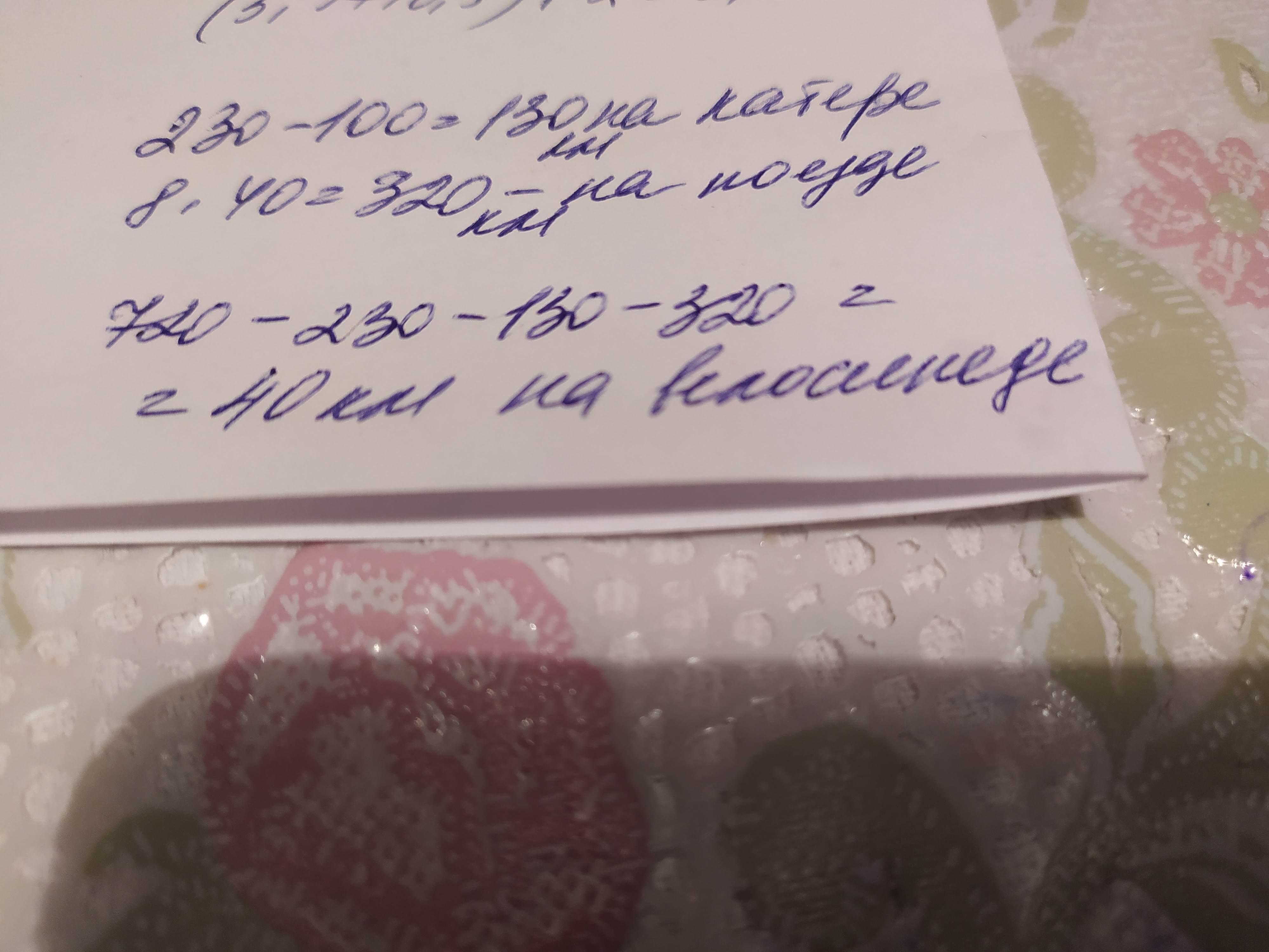 Путешественнику надо преодолеть 720 км. На автобусе он проехал 230 км, проплыл по реке на катере на 100 км меньше, чем проехал на автобусе, а на поезде 8 ч со скоростью 40 км в час. Остальное расстояние на велосипеде. Сколько км путешественник проехал на велосипеде?