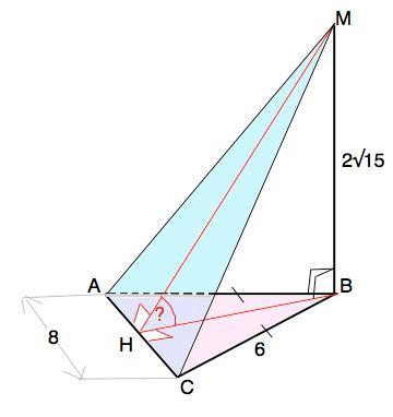 Через вершину В треугольника АС, в котором АВ = ВС = 6 см, АС = 8 см, проведены перпендикуляр МВ к плоины треугольника. Найдите угол между плоскостями АВС и АМС, если МВ = 2√15см. ПОЖАЛУЙСТА ГЛАВНОЕ РИСУНОК