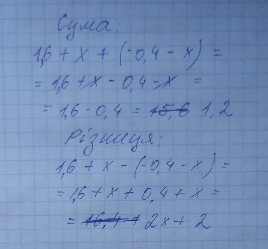 сумма 1,6 +х+(-0,4 – х)=1,6 +х-0,4 – х=1,2