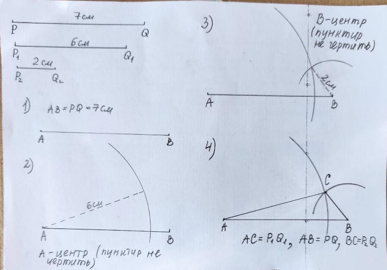 Пусть в построенном ΔАВС, АВ=PQ=7 см , AC=P₁Q₁=6 см ,BC=P₂Q₂=2 см
