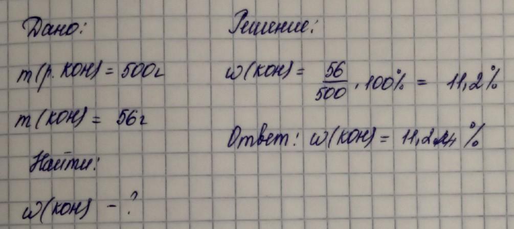 ПЖЖЖЖЖЖЖЖ ПОМОГИТЕ Какова массовая доля (%) гидроксида калия в растворе, если в 500 граммах этого раствора содержится 56 г щелочи?