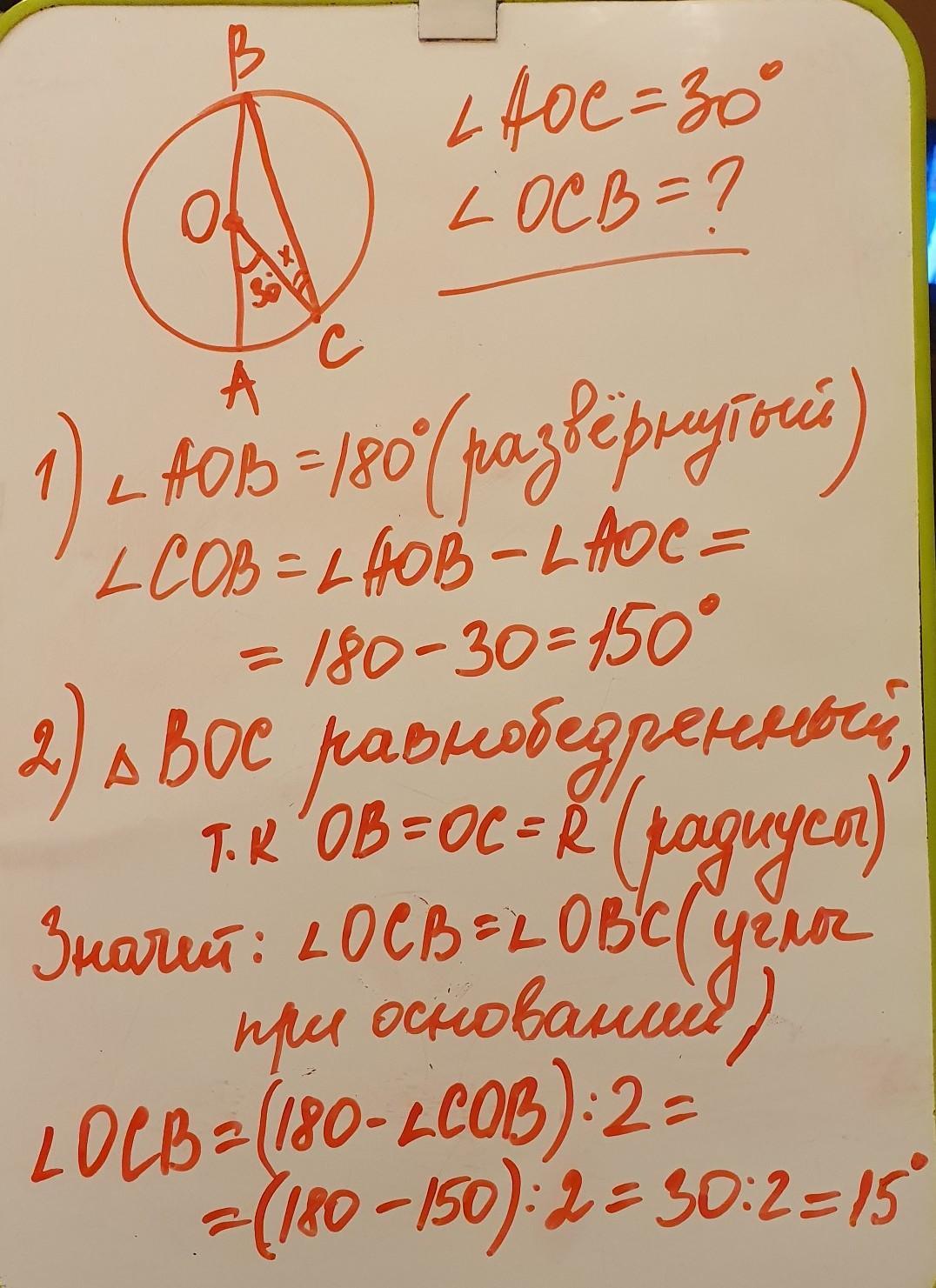 на рисунку О- центр кола А,В,С точки кола. Знайдіть ОСВ якщо кут АОС=30°