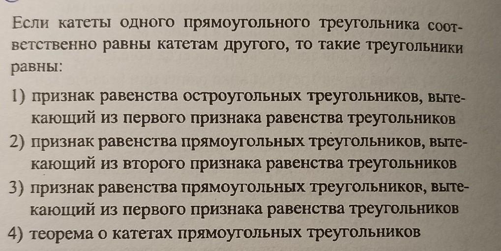 2) признак равенства прямоугольных треугольников, вытекающий из второго признака равенства треугольников.