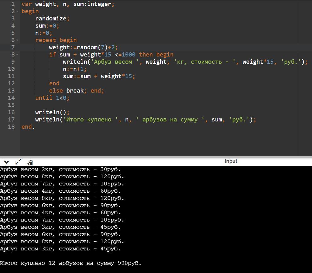 Прерывание цикла. Если сумма вместе со стоимостью "нового" арбуза превышает 1000р, то этот арбуз не засчитывается, а с помощью команды break цикл завершается, после чего происходит вывод результата.