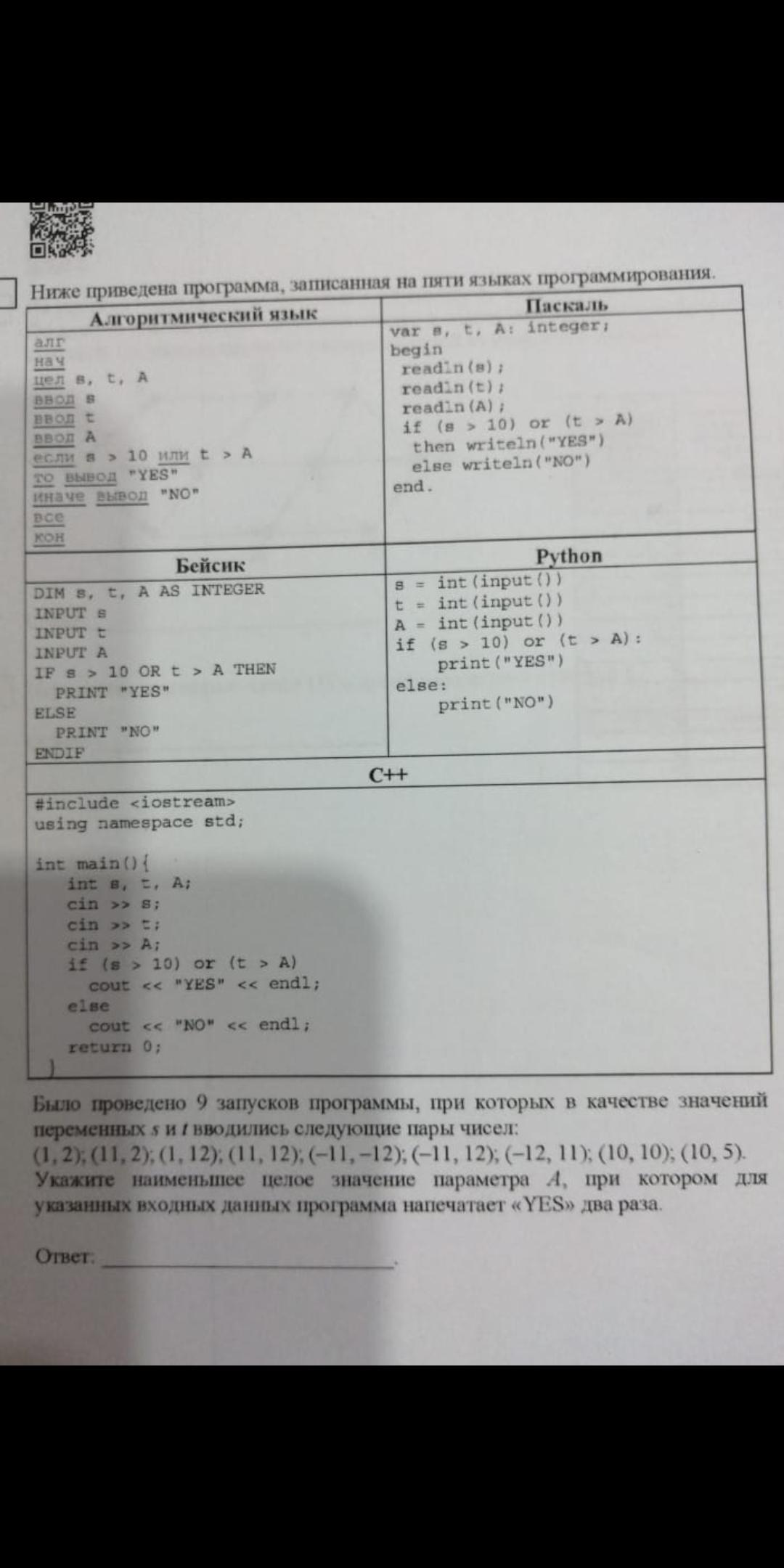 При А=12 второе условие, то есть t > A ни разу не выведет нас на YES; а первое условие, то есть s > 10 выдаст YES при вводе 2-й и 4-й пар. То есть 2 раза как и определено в условии задачи.